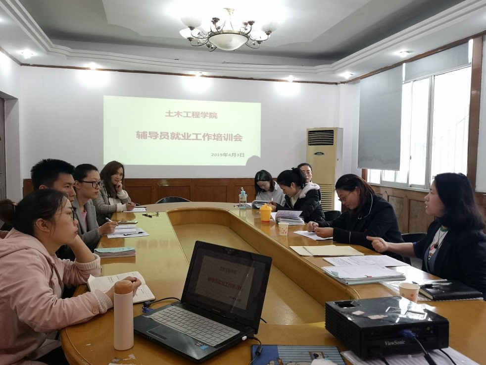 本网讯(文/图 易倩文)为了做好2019年毕业生就业工作,提高做好毕业生就业工作的思想认识,增强做好就业工作的责任感和使命感,进一步明确目标任务,落实工作责任,突出就业工作的针对性,不断提高就业工作的服务水平和质量。4月3日上午9:00,土木学院在会议室212开展了辅导员就业工作培训会。会议由土木学院学工主任管涛主持,诚邀教务处的胡冬梅和学生处的祝毅老师主讲,学院就业科长和全体辅导员参加了培训会议。