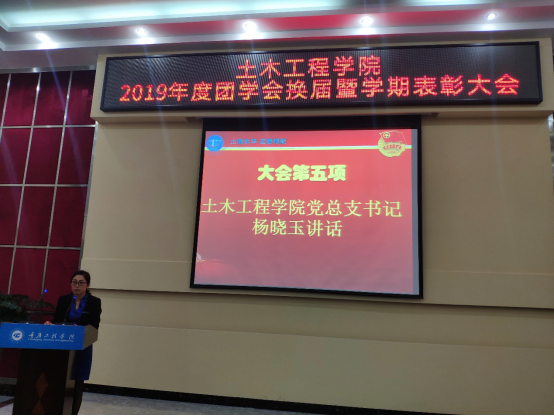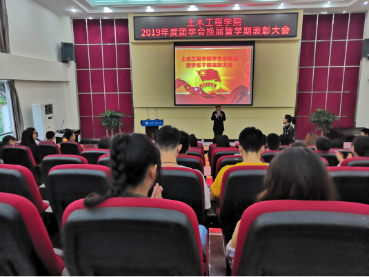 本网讯(文/图 庹向辉)2019年6月12日晚6:40,土木学院2019年度团学会换届暨学期表彰大会在行政阶梯报告厅顺利召开。主持人为学生会艺术团团长余小艳。