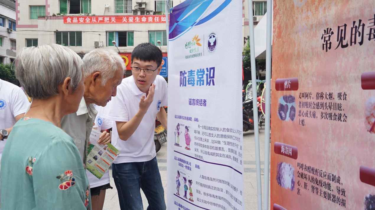 本次活动分为发放宣传资料、提供法律咨询、开展“感恩生命,健康生活”主题海报展览3个模块。过程中一组宣讲团成员和政府工作人员悬挂禁毒横幅,讲解每张主题海报的内容和毒品的分类特征及危害,并用一些生活中的典型事例让群众知道易染毒品的种类及如何防范毒品的入侵;另一组宣讲团负责发放禁毒宣传手册和礼品、解答问题,纠正市民对毒品和艾滋的一些错误理念。最后,在宣讲团合唱《勇敢说不》、《感恩的心》及啦啦操表演中此次活动圆满结束。