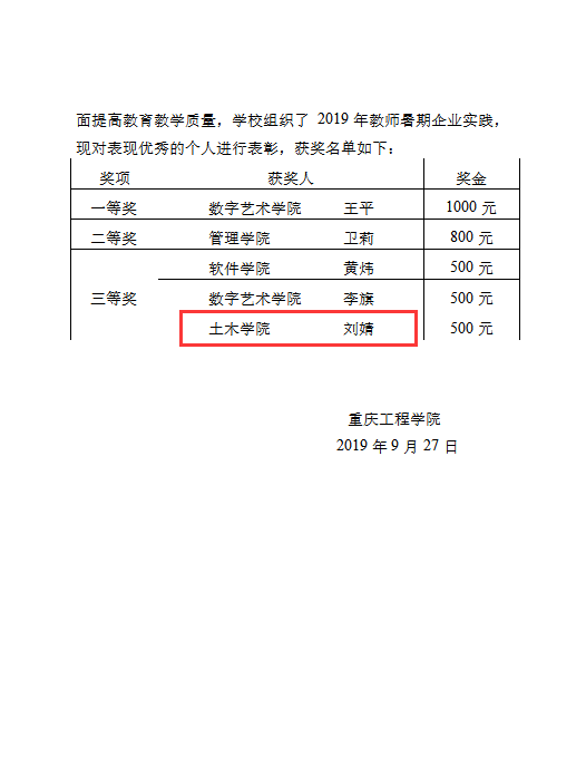 本网讯(文/图 郑楝之)为建设一支高水平的应用型本科教师队伍,深化“产教结合、校企合作”,总结实践经验、理清思路、分享收获,学校于9月25日组织了2019年教师暑期企业实践交流会。土木学院环境设计系刘婧老师获得三等奖,同时被评为校级“优秀个人”。