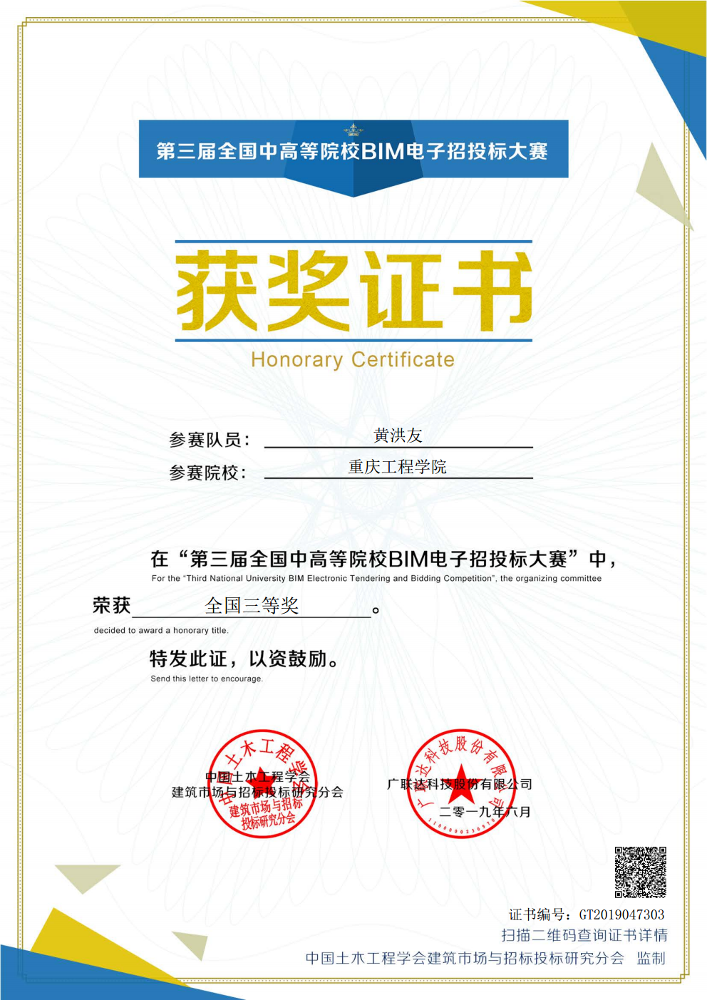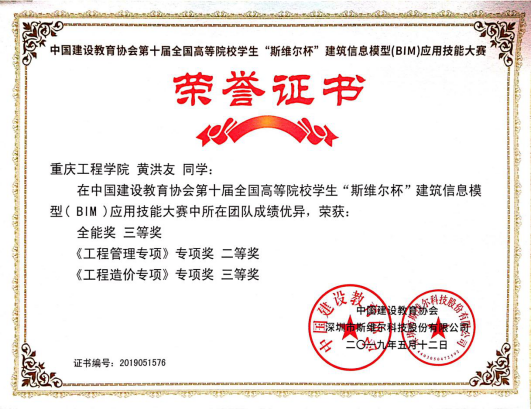 编者按:在土木工程学院,只要提到“BIM大神”,大家一定会说出“黄洪友”这个名字,他不仅是土木工程学院学生会副主席,还担任了重庆工程学院BIM俱乐部技术部部长,并且连续3年在国家级“BIM”比赛中获奖,同时还获得了国家奖学金、励志奖学金、优秀学生干部等荣誉。现在就跟我一起来了解这个专业技能强,综合素质高,浑身充满正能量的“BIM大神”,2019年国家奖学金获得者——土木工程学院2016级工程造价专业黄洪友同学。
