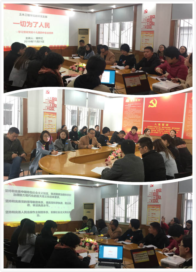 本讯网(图/文 令永强)为学习贯彻落实党的十九届四中全会精神中坚持和完善中国特色社会主义制度、推进国家治理体系和治理能力现代化。2019年11月23日中午,土木学院教师党支部在土木办公楼212会议室,召开土木学院教师党支部大会暨“一切为了人民”党课学习,会议由教师支部书记塔怀红主讲,学院全体党员教师参加了本次会议。