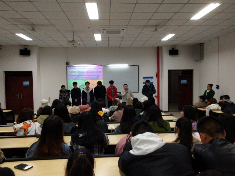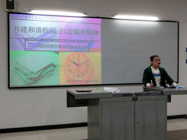 临近班会尾声,作为17级环境设计专业篮球队的队长周沛同学还带领整个篮球队上台呼吁各位同学“同学间因事发生口角和磨擦,应本着与人为善,互相谅解的态度,及时报告辅导员或学校护卫队进行调解。希望同学们树立较强的自我保护意识,冷静克制、切勿莽撞,恪守本分、互相互让、求同存异、理解万岁。”