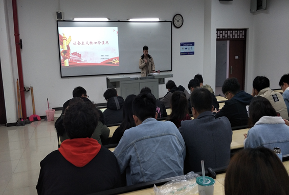 班会伊始,谭鑫淋同学作为本次活动的主持人,对社会主义核心价值观进行了解读,宣传了党的最新思想和价值体系。随后,卢尤贵同学给大家深入解读了社会主义核心价值观。她主要从概念内涵、基本原则、践行路径来为大家讲解。卢尤贵同学解读完毕后,同学们积极主动起来分享自身对社会主义核心价值观的理解和看法。经过同学们的分享之后,他们对社会主义核心价值观的认识和理解更加的深入,在思想层面上升了一个阶梯。紧接着主持人给大家分享了一段关于社会主义核心价值观的微视频,视频中的同学们只要对“24”字社会主义核心价值观进行了详细的解读,提倡大学生要培育和践行社会主义核心价值观,适应自身年龄和特点,做到记住要求、心有榜样、从小做起、接受帮助。视频播放完毕后,主持人向全体同学发出倡议:作为当代大学生要把社会主义核心价值观融化在心灵里,结合学习和生活等实践不断的加深理解,这样才能真正的做到社会主义核心价值观这面旗帜在时代新风中更加鲜艳。