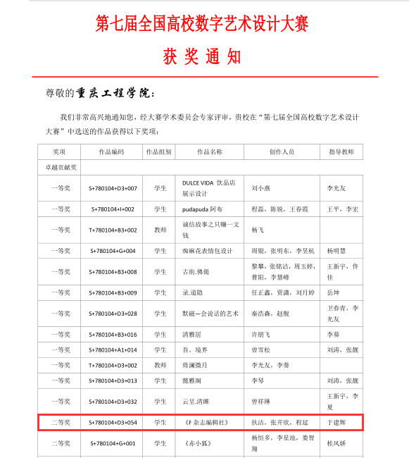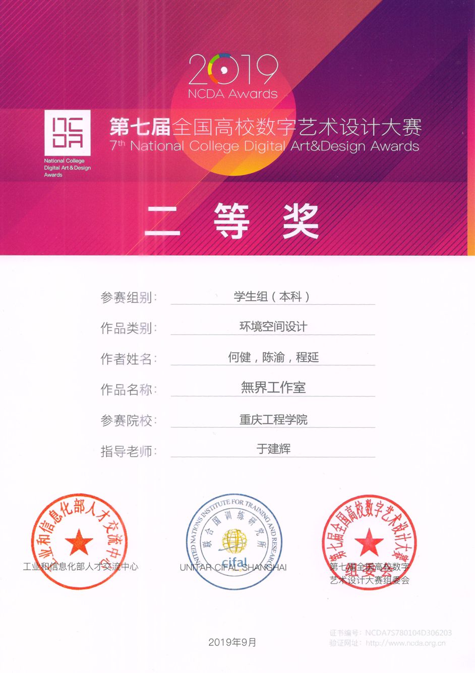 本网讯(文/图 于建辉)近日,由工业和信息化部主办的第七届全国高校数字艺术设计大赛(NCDA)评审结果揭晓,土木工程学院环境设计系13名学生参赛,共揽获6项大奖,其中何健、陈渝、扶洁等10名学生获得学生组(本科)二等奖共4项;彭雪峰、刘建桦等4名学生获得学生组(本科)三等奖共2项。