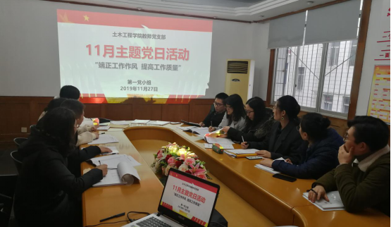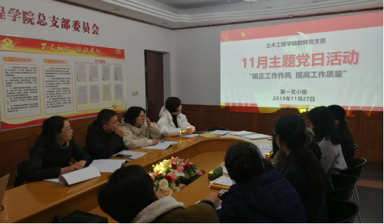 本讯网(图/文 贵体进)为进一步贯彻落实学校“迎评促建”战略要求,学习与领悟土木工程学院 2019 年第16次党政联席会会议精神,2019年11月27日下午在土木办公楼212会议室,土木学院第一党小组召开“端正工作作风,提高工作质量”主题党日活动,会议由教师教师支部书记塔怀红主持,学院第一党小组全体党员及部分教师代表参加了本次会议。