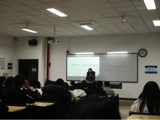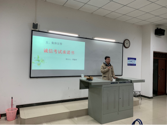 班会开始,易老师先给同学们讲解了学校关于考试舞弊的相关文件,提醒同学们要认真阅读,在最近要进行的英语四六级和期末考试中不要触及这些红线。稍后,由1795002班同学代表上台给同学们分享了一个关于考试的趣味视频,其中关于考试舞弊和祈求考试通过的部分引得大家哄堂大笑,此视频中告诫同学们要踏实学习,不要作弊的部分更是引人深思。最后在谭鑫淋同学带领下,易老师跟同学们一起进行了诚信考试誓词宣读。