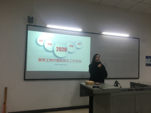 不忘初心,砥砺前行。2020年的第一天跟同学们如约而至,2020年的第一次“大家庭聚会”于晚上9点准时开始。新年伊始,辅导员从“五个一全校验收”、“离校安全教育”、“期末考试安排”、“寒假社会实践之年味大赏”和“新年计划”这五个方面开始本次的班会。首先在对寝室的“五个一”验收方面,四个班的生活委员准确、详细地向同学们汇报了情况,各班寝室总体情况良好,个别寝室需要改进和调整。随后辅导员易老师跟大强调了离校安全教育,跟大家详细的说明了离校、返校、考试、补考通知等具体的时间。其中在本次班会上,她着重提到“寒假社会实践之年味大赏”。下个学期初的年味大赏将从土特产展示(茶话会)、我的中国年(摄影大赛)、青春心向党建功新时代(全面阅读、感恩父母)这三个主题内容展开,同学们根据自己感兴趣的内容,多做准备。最后,她让同学们做好自己的新年计划,在崭新的一年中规划人生,提升综合素养,实现自己人生的价值。