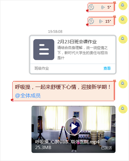 班会中,通过群内语音讲解和播放PPT录播的形式,深入浅出地讲解了新时代大学生在疫情时期的责任担当。班会从执行力、分辨力、自制力这三“力”进行展开。在执行力方面,辅导员要求大家思想上有认识,行动上有配合,执行上要积极。辅导员窦晖老师特别强调,一定遵守不准提前返校的校规,同时她还提醒同学们关注自身的心理健康,并给大家推荐了呼吸操的教学视频;在分辨力方面,她重点强调大家不传谣、不信谣、不造谣,及时关注权威信息;在自制力方面,她给大家提出了合理规划、不负韶华的殷切希望。最后,辅导员窦晖老师针对本专业大家课程安排,向各位同学做出要求,让每位同学做好停课不停学不停教,完成好疫情防控期我校在线教学组织与管理工作,并在会后布置了一道关于大学生责任的思考题。在此期间全体同学认真聆听并做出回复和保证。