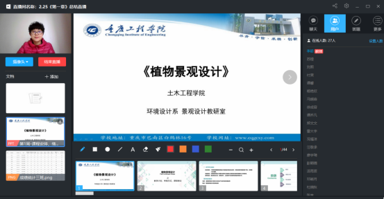 接到通知的当天,做为一名在教学第一线工作了8年的我来说,突然觉着是一种挑战,所以及时调整自己的心态,找到自己的不足,集中精力研究超星智慧课堂及直播软件。《植物景观设计》课程教师团队在线经过多次讨论、演示、分析最后确定使用超星加钉钉的模式开展本门课程在线教学任务;接下来与超星客服专员牟锐建立了互助关系,每天不断地学习如何建课,如何解决问题,如何熟练使用等内容,通过一周的努力,已经把课程基本建设完成,此时考虑到线上教学的特殊性,以及学生身处不同地域的网络流畅性等实际问题,为了保证授课质量并让课堂变得丰富有趣,我们团队引用了《园林植物景观设计》一门幕课(MOOC)及一本金煜主编的在线教材作为参考书,结合以上知识点又重新制定了本学期的教学大纲、课程进度表、教案等内容。