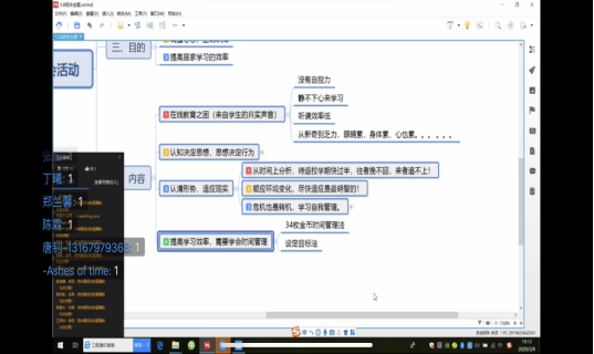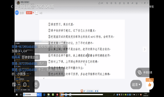 班会伊始,班导师涂异老师阐述了本次的交流会上着重讨论大家最近的学习情况,提升大家的学习状态,提出在疫情之下,停课不停学,专注于线上学习,调整心态,正确认知,提高居家学习的效率。接下来,她从在线教育之困、认知决定思想,思想决定行为、认清形势,适应现实、提高学习效率,学会时间管理这四个方面来开展本次的线上学习交流会。她首先抛出了大家在线学习的多项困扰,如:没有自控力,听课效率低等各种问题。针对出现的问题,她勉励大家要正式困难,乐观面对,内心要平静,加强学习的动力。接下来,凃异老师给大家在形势上和时间上进行了具体的分析:待返学习学期过半,往者挽不回,来者追不上,将危机变为转机,学会自我管理。最后,她分享了34枚金币时间管理法、设定目标法,让大家提高学习效率,学会时间的管理。涂异导师分享完毕后,工造4班王敏瑞、祝霞、樊港同学也在班群里面分别分享了在疫情期间自己的学习心得。