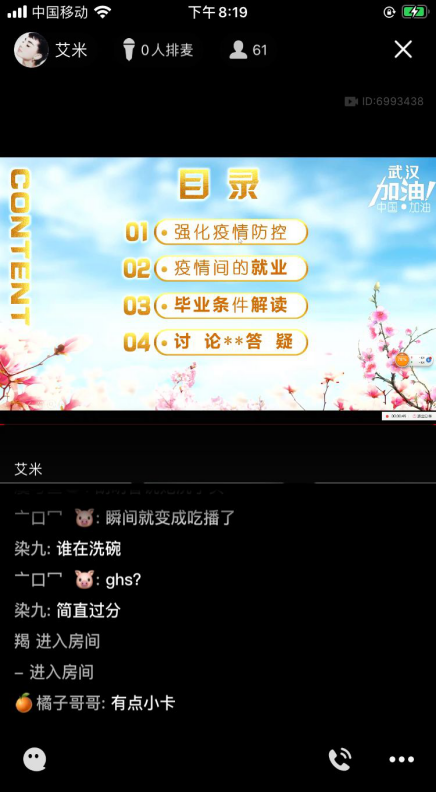 班会伊始,辅导员易倩文用视频会议的方式向大家致以问候,同学们有序进行签到。此次主题班委围绕疫情防控、疫情间的就业、毕业条件解读以及讨论答疑四个环节有序展开。辅导员首先播放了防疫科普小视频,同学们认真观看,踊跃回答各种防疫小知识。接着,易老师重点讲解了返工复工后如何做好疫情预防措施,她强调要远离人群密集的的地方,勤洗手,戴口罩。随后,她对2020年就业现状和政策进行分析,梳理展示近期学校发布的各种就业信息并且解读了各类文件和通知,尤其重点指导了同学们就业简历的编写和在线面试的技巧。为了让同学们更好地为毕业做准备,她结合17级室内艺术专业人才培养方案,向同学们解读了毕业所需的条件以及需要准备的材料和相关手续,并且提醒同学们在找工作的时候一定要询问是否可以签三方协议,一定要确保自己的合法权益得到保障,并且再次向同学们强调了“三严禁,四不准”。最后,同学们各抒己见,激烈讨论,辅导员在线进行答疑。