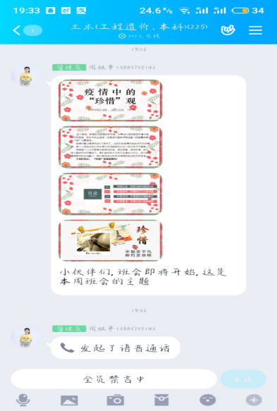 “幸福是平凡,拥有是珍惜”,班会开始,辅导员周林平通过此次疫情向同学们强调了珍惜生命,明天和意外不知道哪一个会先来,号召同学们珍惜生命、珍惜时间、珍惜情谊,珍惜无限价值的未来。同时,周老师也鼓励我们经历了上一次英语四级考试的失败之后,更应该把握时间,在疫情期间积极主动学习,培养好良好的学习习惯,提高学习效率,增强专业课学习的技能。随后,周老师针对同学们本周的网课学习状况,对同学们提出了几点建议:她要求同学们认真听课并完成专业老师布置的任务;网课也要认真对待,课堂上积极发言;严禁违反课堂纪律等。最后,周老师呼吁我们在家期间,珍惜与父母相处的时光,体味眼下的点点滴滴和欢声笑语,珍惜大家小家的温暖!