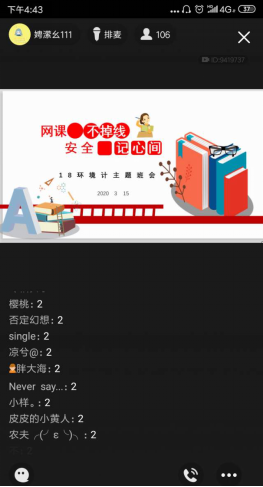 本网讯(文/窦晖 图/胡爽)2020年3月15日16时,18级环境设计专业召开了一场主题为“网课不掉线,安全记心间”的安全云班会。本次班会由辅导员窦晖主持,传达了学校关于疫情防控工作的最新要求,并对学生居家学习生活中应注意的安全问题做了进一步的强调,运用幽默小视频的形式再次提醒学生在家注意防护,减少外出、不返校,加强体育锻炼。同时,窦老师还要求同学们遵守网课纪律,制定时间表,勤思、慎独,肯定自我,确保身体和心理都健康不掉线。班会结束后窦老师布置了群作业,引导学生发现自己的闪光点,督促其在家积极参与家务劳动。