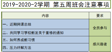 班会开始,窦老师首先对近期网课做了总结,并且提醒同学们为开学做准备,她分别从以下5个方面提出了指导性建议,1、净心、静心,调整好心态,清扫内心,通过练字、听音乐等措施让心静下来;2、规律作息,调好闹钟,有规律的起床睡觉,上下课;3、阅读、收心,多阅读书籍,增加自己的阅读量;4、制定计划,上网课期间也要自律,制定学期计划以及月计划、周计划、日计划,坚持努力,慢慢拔尖;5、防止诈骗,注意网上诈骗,注意查看班级大群消息,不要误信传谣。随后,辅导员窦晖老师组织全体学生一起学习《重庆工程学院本科生课程重修管理办法(试行)》通知,她对此通知的课程重修的定义、范围和重修方式、教学组织及管理等做了着重讲解。