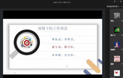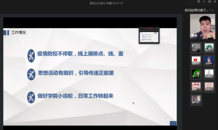 全体辅导员们围绕“新冠疫情下学生工作反思”、“辅导员战疫的法宝”、“新冠肺炎疫情下的辅导员工作-做好三种角色”、“疫情之下:辅导员机智研究”、“多角度育人,全方位防疫”、“疫情之下,把学生放在心里”以及“抗疫在学-时时连线,事事上心”等主题进行了交流发言,各位辅导员准备充分,他们结合辅导员的九大工作职责,对自己近2个月的学生工作,结合辅导员九大职责做了详细梳理、总结和反思,分享了宝贵的工作经验。此次交流会促使大家互相学习,共同进步。