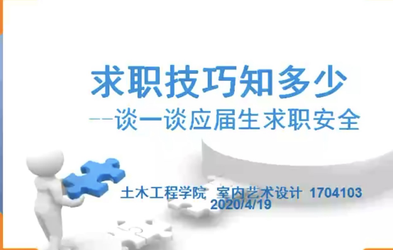 本网讯(文/图 胡鸿)为进一步做好毕业生就业安全工作,提高大家安全责任意识,强化大家安全防范能力,同时积极宣传国家安全日教育工作,2020年4月19日,20:00-20:30,1704103班召开了主题为“求职技巧知多少”的网络云班会。