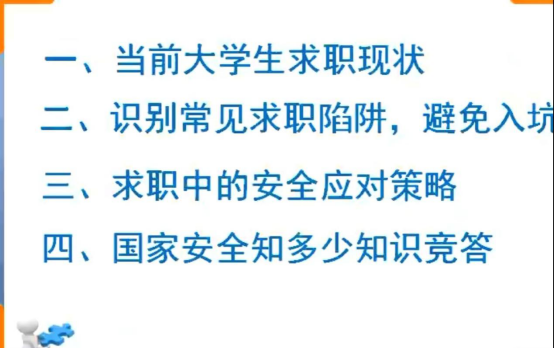 通过此次“求职技巧知多少”主题班会的开展,大家的安全意识得到了提高。就业安全关乎大家生命财产,前途发展,国家安全关乎国家的兴亡,切身利益,我们既要保护好自身安全,又要维护好国家安全,积极履行维护国家安全的法定义务,不断提高防范意识和防范能力。