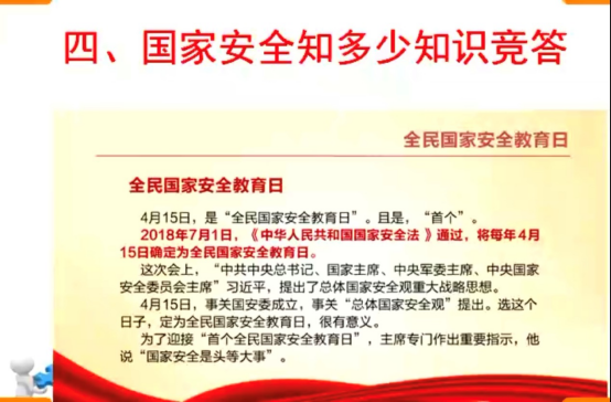 随后,郭老师又向大家阐述了“国家安全日”的背景、意义和学习目的,要求大家掌握国家安全日重要内容,并且采用知识竞答的形式传授了大家如遇到国家、社会以及自身安全隐患的防范方法和途径。