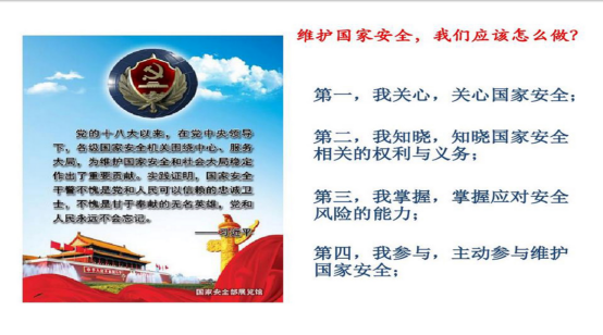 本次班会由班长简明欢主持,本次主题班会从“了解国家安全教育日的含义,国家安全的分类,作为大学生的我们应该怎样做以及案例回顾”四个方面展开。简明欢首先向大家讲解了国家安全日的含义以及国家安全的类别;其次,他向同学们提到作为当代大学生应该如何维护国家安全的具体举措,并且分享了几个反面案列,让大家知道了破坏国家安全的危害有多大;随后,又通过播放视屏让同学们进一步了解国家安全日。最后的发言环节,同学们都积极参与,讲述自己内心的感受。