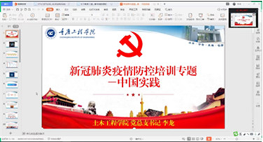 本网讯(文/图 土木工程学院 毛云莹)2020年4月29日,土木工程学院利用企业微信视频会议开展了“新冠肺炎疫情防控”专题培训。培训由党总支书记李龙领学,执行院长雷江参与在线授课,学院全体教职工参加了培训。