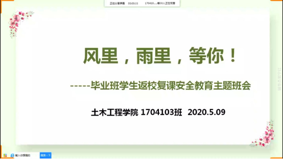 本网讯(文/图胡鸿)2020年5月9日20:00-21:30,土木工程学院室内设计专业1704103班召开了一场主题为“风里,雨里,等你!”的2020年春季学期毕业班返校复课主题班会。