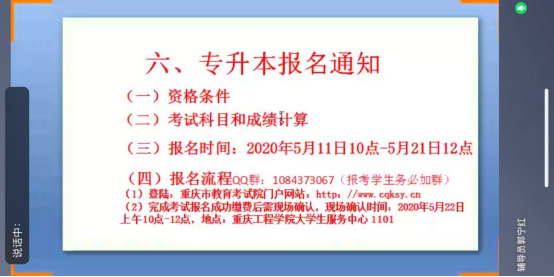 本次班会由辅导员郭宁红主持召开,首先,郭老师向大家详细解读毕业年级返校复课的时间、返校所需要提供的材料、返校前的准备、返校途中的注意事项、返校报到的流程、返校后对大家的日常管理、以及学校疫情防控期间采取的封校管理规定和必要的临时性管制措施,她提醒同学们知晓学校应急处置流程;随后,辅导员郭老师带领大家观看《同心战“疫”》特别节目,一同学习疫情防控相关知识;最后,她在QQ群给大家展示了《2020年重庆工程学院专升本报名通知》,并对其内容进行详细的解答,她提醒专升本的同学坚持到底,好好复习。
