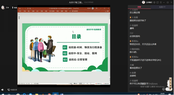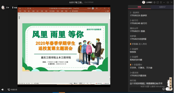 班会正式开始之前,辅导员易倩文老师在线解读了同学们的弹幕,并对同学们的困惑进行了相应的解答。本次班会围绕时间安排、返校条件、返校前准备、返校后安排以及返校后日常管理5部分展开。首先,易老师告诉大家17级本科学生返校的日期在2020年5月16日-17日,正式的上课时间为18日。作为返校的条件学生们应该准备些什么呢?14天钉钉打卡记录截图、14天行程记录、承诺书、防疫课程截图、渝康码截图,满足这五个条件学生即可返校,若无满足则会暂缓返校。随后,易倩文老师敦促大家要准备好返校的相应物资准备、行程准备,在返校后也要注意返校后的安排:返校途中注意事项、返校接站安排、返校报到流程。随后,她着重强调了返校后的日常管理,提醒同学们一定要遵守学校规则,配合学校管理。最后,易老师还带领同学们一起学习了防疫小视频,再次提醒同学们一定要注意个人防疫,勤洗手,常通风,加强锻炼,提高体质。