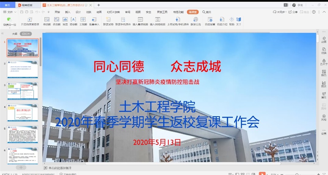 本网讯(文/图 土木工程学院 毛云莹)2020年5月13日,土木工程学院利用企业微信视频会议平台召开了“2020年春季学生返校复课”工作会。执行院长雷江、党总支书记李龙、教学副院长汪金能分别对相关工作进行了详细部署,全体教职工参加了会议。