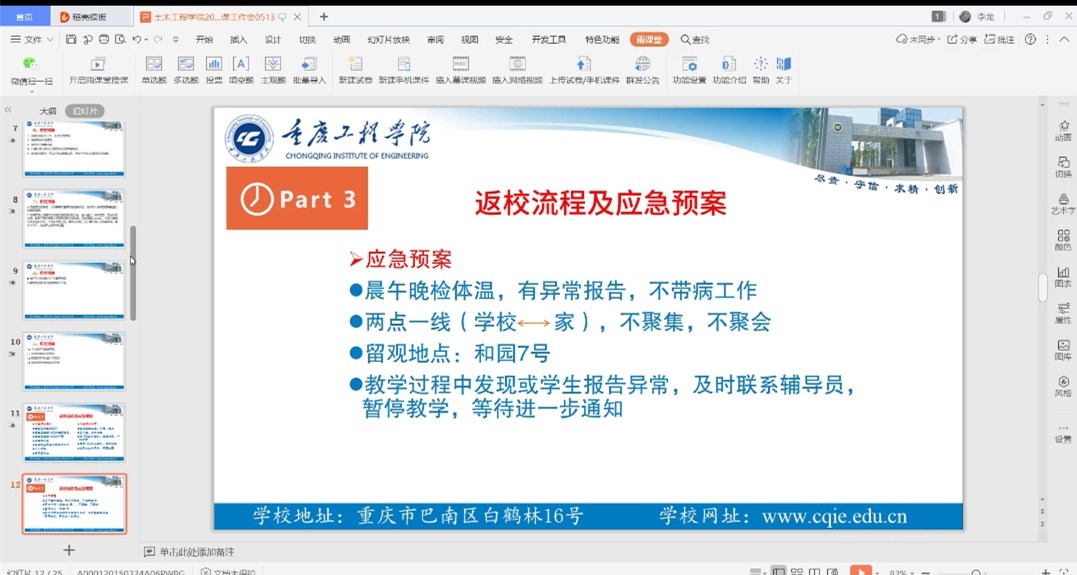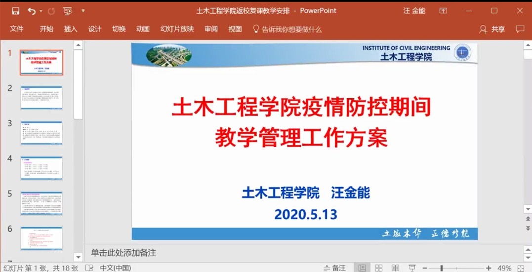 汪金能副院长强调了返校后的教学工作安排,要求全体教师按照《土木工程学院疫情防控期间教学管理工作方案》做好返校复课的教学准备,确保线上线下教学有效衔接,并以课程为单位制定《线上线下教学衔接应急预案》,同时做好随时重启线上教学的各项准备,确保教学任务零差错。