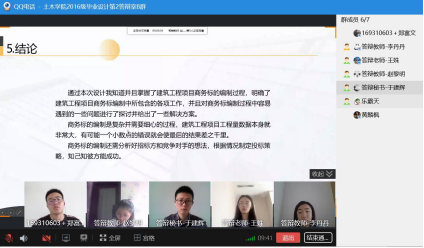 由于受疫情影响,本次毕业设计答辩工作以网络答辩的形式进行。为保证毕业设计答辩顺利实施,学院精心制订了毕业设计答辩工作实施方案,成立了以雷江院长为组长的专项工作组,工程管理系直接负责所属专业的答辩工作。本次答辩一共设置了11个网络答辩室,每个答辩组安排了4名高职称、高学历的老师担任评委,从组织机构上保证本科毕业答辩的质量。
