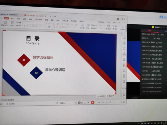 本次班会由辅导了窦晖老师主持,她特别强调明后天返校流程和返校后日常管理的细则;此外,她还对如何调适复学心理做了详细的讲解。此次班会围绕以下三个方面展开:一、行为方面的准备,辅导员窦晖老师强调一定要调整好作息时间,返校后遵守学校的各种防控措施;二、情绪调试方面的准备,要求大家理性认知,积极调整情绪,保持充沛精力,做好校园生活、学习“复位”。三、人际关系方面的准备,在疫情特殊时期,返校后面临的人际关系会有相应的变化,应采取理解和包容的态度。