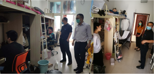 雷院长一行先后到和园3号一单元与和园5号学生宿舍进行走访,在走访过程中,雷院长要求同学们在整理好宿舍清洁卫生的同时,尽快调整好学习状态,积极投入线下学习,加强与老师们的沟通,同时,务必按照学校要求做好疫情防控与个人防护工作。