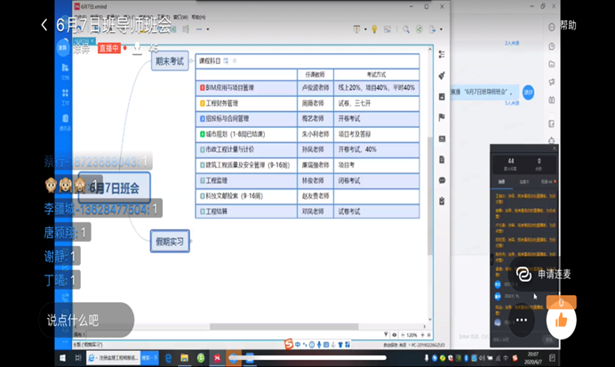 本网讯(文/图 杨风帆)为了迎接本学期的期末考试,调动同学们的学习积极性,也为了筹备在假期的实习工作,土木工程学院17级工程造价专业4班,于2017级工程造价4班钉钉班群通过在线直播的形式召开了一场主题为“备战期末,规划假期”的云班会。本次班会由涂异导师主持,17级工程造价4班全体成员参与。