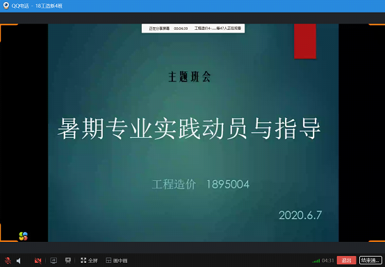 本网讯(文/图 霍柯琳)为进一步动员学生暑假期间参与到专业实践活动中去,正视自我,完善自我,发展自我,1895004班于2020年6月7日20:00召开了一场主题为“暑期专业实践动员与指导”的网络云班会。