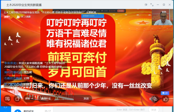 本网讯(文/李龙·图/雪小飞)2020年6月9日晚7时30分,土木工程学院党总支通过钉钉群直播在2020届毕业生党员中开展“不忘记初心勇担使命·砥砺奋进继续前行”主题教育活动,包括有“上好一次党课、重温一次入党誓词、参与一次经验交流会、做出一份庄严承诺、站好文明离校最后一班岗”等“五个一”主要内容,活动充分利用互联网媒介载体,线上线下方式相结合,以“增强党性、提高素质”为重点,不断推进“不忘初心,牢记使命”主题教育常态化,教育引导广大毕业生党员增强“四个意识”、坚定“四个自信”、做到“两个维护”、充分发挥先锋模范作用,带动身边更多学生回馈母校、报效祖国。