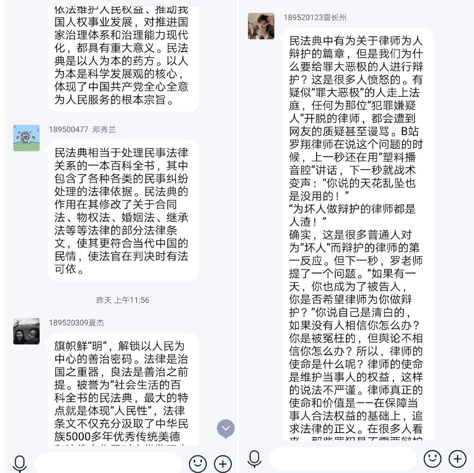 活动伊始,土木工程学院学生干部纷纷参与线上学习,不仅各自讲述了自己所学习的、认识到、了解到的民法典,还在组织开展民法典学习宣传活动中,始终坚持了正确政治方向和舆论导向,引导学院学生干部深刻认识我国法治建设的重大成就,更加坚定走中国特色社会主义法治道路的信心和决心。认真落实了学法用法,推动民法典学习宣传深入开展。开展分众化、对象化宣传,注重群众参与互动,增强学习宣传的针对性实效性。使得“认识民法典,走进法治新时代”这一主题活动,真正做到了让民法典走到群众身边、走进群众心理。