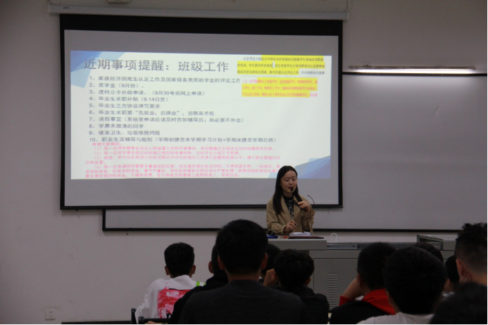 本次班会由辅导员郭宁红主持,班会主要强调四个方面--常规疫情防控安全、安全类型介绍及注意事项、新学期开学的相关工作、学平险的介绍对比及售后服务。首先, 郭老师强调疫情当前,我们需做到“零报告、日报告”,身体不适及时就医。做到不漏报、不谎报、非必要不请假的原则,有效维持校园疫情安全。其次,她提醒同学们安全极为重要,食品安全、人身财产安全、消防安全,网络安全等是我们生活中常见的几种,郭老师以真实的故事让我们谨记,强调安全是我们生活的底线,不要轻易触碰。接着,郭老师给大家介绍了开学之后相关工作的安排,尤为重要的是贫困生的认定和建档立卡补助申请以及未交学费提醒。郭老师提醒大家职业生涯辅导与规划要重视。要做到自律、规范作息、增强身体锻炼,以达到高效学习的目的。最后,郭老师介绍学平险产品的优势及与医保的区别,重点介绍我校学平险的内容以及售后服务等,让同学们清晰的了解和自愿购买这款产品。