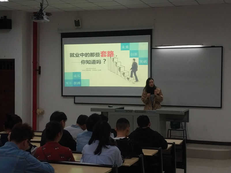 本网讯(文/图 唐建伟)随着国庆长假的结束,为了让毕业班的学生提高就业安全意识以及就业竞争力,土木工程学院工程造价1795001-4班10月8日20:00在6301教室开展了“就业中的那些套路”返校主题班会。辅导员易倩文主持了本次班会,在校学生全员参加。
