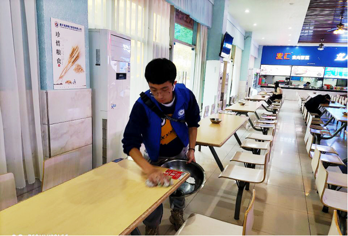 此次活动招募青年志愿者共10名,分为两组。由会长强调注意事项后,各组长分别将队员带到百谷园和一食堂。志愿者们在食堂帮忙阿姨擦桌子,将饭桌上的饭粒、残渣回收到餐具回收处,为下一位吃饭的同学提供干净的桌椅,再将饭堂里的桌椅摆放整齐并用扫把打扫地面上的饭粒、残渣与垃圾、清理卫生死角,同时也帮忙维护食堂次序,让同学们有序进餐。在志愿活动的过程中,不仅对食堂运作有了深层次的了解,同时也深刻体会到了食堂阿姨们工作的艰辛。也希望同学们进行文明就餐,就餐后顺便收拾残渣和垃圾,给后来就餐的同学们营造一个好的就餐环境,将重工学子的优良的品行和素养展现。