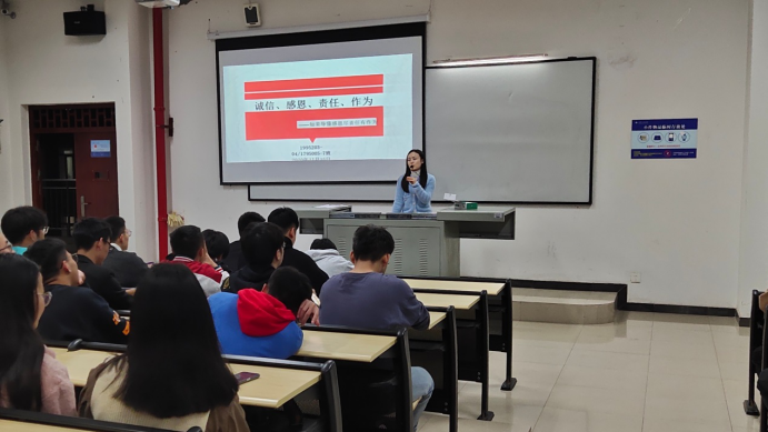 本次班会由辅导员郭宁红主持,主要强调“诚信、感恩、责任、作为”对大学生的重要作用。首先是“诚信”,我国自古就有“人无信不立”的说法,这表明了诚信在我们的生活中的重要,我们的衣食住行都离不开诚信。再是“感恩”,感恩父母、老师、朋友,感恩他们给予我们的帮助,感恩我们所遭遇的困难,它们给予我们成长。再是“责任”,每个人都有他的责任,或大或小,它使我们勇于担当,敢于挑战,乐于付出,我们大学生的责任就是:努力学习、打好基础、回报社会。最后是“作为”,词人李清照曾写过“生当作人杰,死亦为鬼雄”,每个人都只有一辈子,有人名垂青史,有人碌碌无为,不努力一把,不有作为一把,怎么对得起这短暂的人生呢?至此,一个短暂而充实、引人思索的班会圆满结束。