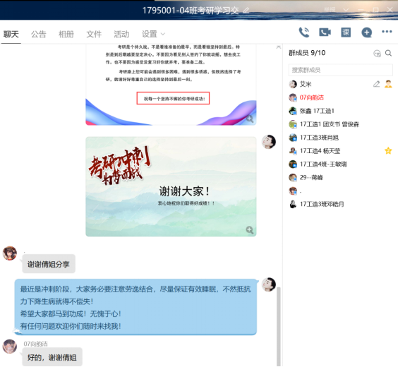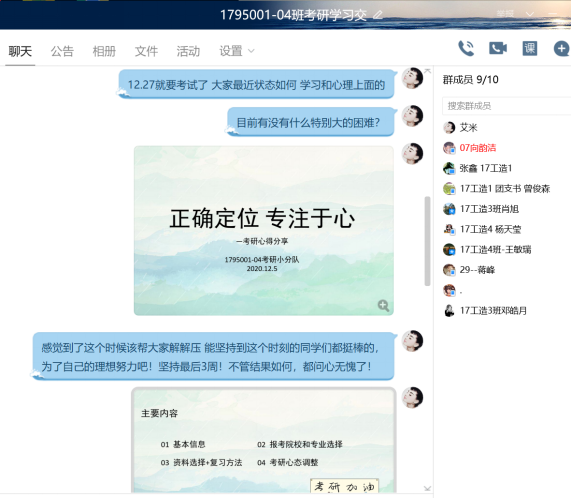 本网讯(文/图 易倩文)在同学们即将奔赴考研战场之际,在最后的冲刺阶段,辅导员易倩文为了给考研的同学们鼓劲加油,特意利用周六的晚上8:00-8:30,在1795001-04班的考研小分队QQ群开了一场线上的学习经验分享交流会。全体考研同学参与。