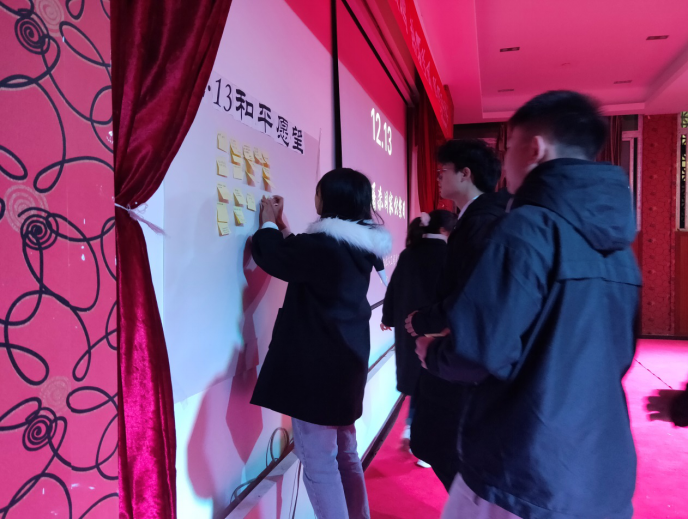 本次活动由杨蓉同学主持,首先,通过党总支副书记唐和平讲话、焦心雨同学的介绍和童渝超同学的发言,让同学们更加了解并牢记这段悲痛的历史。紧接着,看完由学院录制的公祭日视频后,同学们自发为南京大屠杀遇难同胞默哀。最后,学子们在便签上写下和平祝福语,号召大家牢记历史、反对战争、珍爱和平!