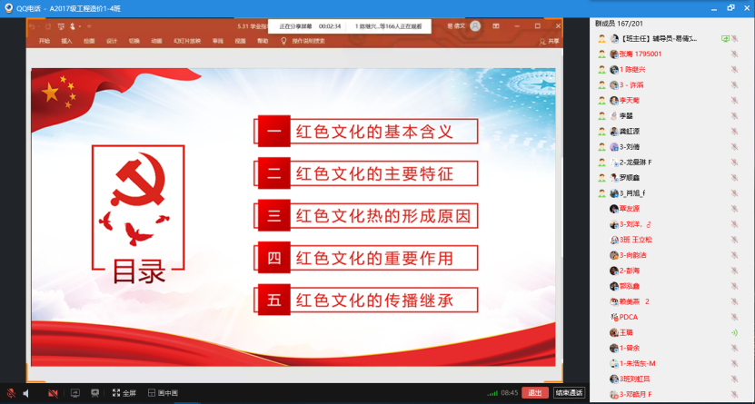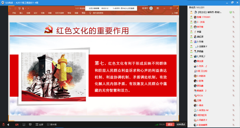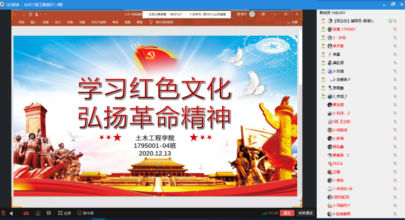 本网讯(文/易倩文 图/李曌)红色文化是在革命战争年代,由中国共产党人、先进分子和人民群众共同创造并极具中国特色的先进文化,蕴含着丰富的革命精神和厚重的历史文化内涵。它体现了中国不同历史时期的先进文化,影响了社会发展的进程,反映了时代精神,为具有中国特色的社会主义建设提供了精神食粮。为了让同学们更好地学习和理解红色文化,弘扬革命精神,勇担时代重任,土木工程学院辅导员易倩文老师于2020年12月13日20:00在17级工造1-4班QQ大群开展了“学习红色文化,弘扬革命精神”线上主题班会。17级工程造价专业1-4班全体学生参与。