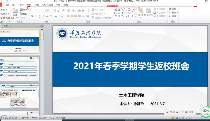 本网讯(图/文 杜帅)为了让同学们调整心态迎接新学期的到来,尽快适应校园生活,同时为了让同学们增强春季传染病防控意识。2021年3月7日晚上8:00土木工程学院涂祖玲老师在网络平台组织召开了“2021年春季学生返校”主题班会。