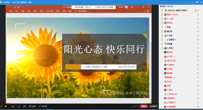 本网讯 (文/图 易倩文)为了更好地了解同学们就业的进程,关注同学们毕业前期就业的心理状态,帮助同学们保持健康心理,辅导员易倩文于2021年3月28日20:00-21:00在2017级工程造价专业1-4班班群以微课的形式开展了“阳光心态,快乐同行”的就业心理安全主题班会。