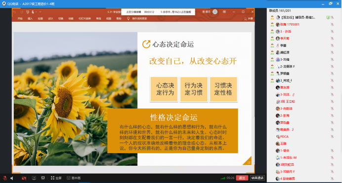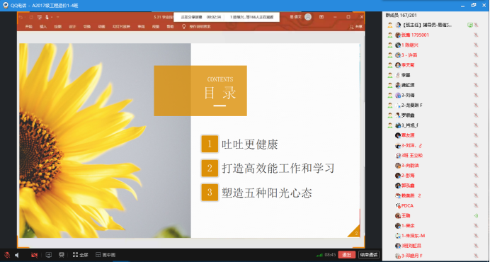 此次班会围绕“吐吐更健康”、“打造高效能工作和学习”和“塑造5种阳光心态”三方面展开。在正式进入到班会主题前,辅导员向大家展示了“就业现状-你们还好吗”的问卷调查结果,道出了同学们近期就业的一些心理情绪,然后她鼓励同学们在直播课堂内纷纷吐露自己的心声,发表自己内心最真实的想法。同学们踊跃发言,各抒己见,易老师认真耐心地听取同学们的吐槽,针针对同学们提出的“时间紧、任务重、心理憋闷”等问题,她向同学们详细介绍了如何打造高效工作和学习的措施以及塑造阳光心态的5种途径,帮助同学们更好地做时间规划,保证就业心理健康安全。紧接着,她分享了自己的学习工作经验,还请同学们在群内分享调节情绪的方式方法,例如,欣赏美景,享受美食等,同学们纷纷响应,在群内展示自己的厨艺,发布自己看过的美景,整个班会顿时走向高潮,洋溢着快乐的氛围。班会尾声,辅导员鼓励大家保持良好心态,劳逸结合,做好规划,认真快乐过好每一天。