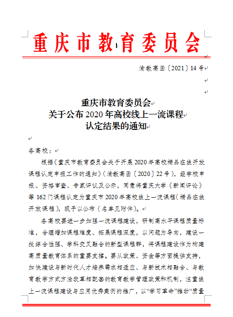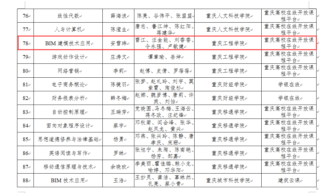 本网讯(文/图 毛云莹)近日,重庆市教育委员会下发了《重庆市教育委员会关于开展2020年高校精品在线开放课程认定申报工作的通知》(渝教高函〔2020〕22号)文件,我校土木工程学院《BIM建模技术应用》课程获列其中,这是我院在线课程首次获评市级精品在线开放课程。