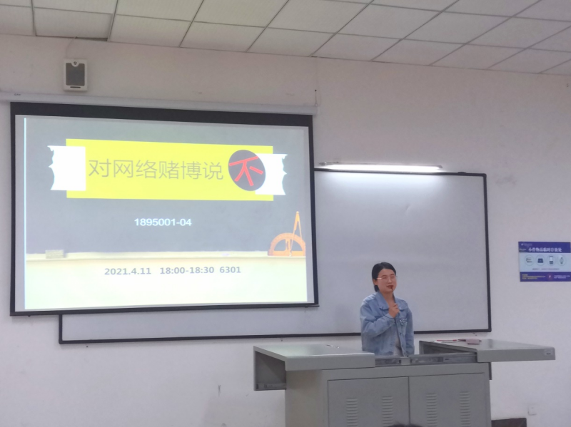 本网讯(文/图 霍柯琳)为引领大学生积极践行社会主义核心价值观,促进大学生身心健康,远离网络赌博,1895001—4班辅导员周林平于2021年4月11日18:00在6301教室召开了“对网络赌博说不”主题班会。