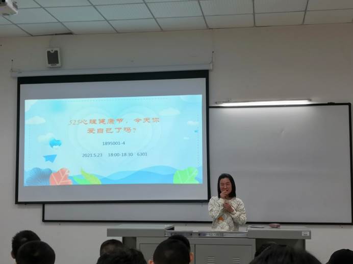 每年的5月25日是全国大中学生心理健康日,‘5·25’的谐音即为“我爱我”,提醒大学生“珍惜生命,关爱自己”。班会伊始,辅导员周老师便向同学们介绍了心理健康节的来历。随后,周老师分析了大学生常见心理困惑,如迷茫与困惑、情绪波动与情感挫折、学习与就业焦人际关系不适等。并从关爱自我、了解自我、接纳自己等几个方面说明如何调节自己的心理。在活动的最后,周老师告诉大家:“学会爱自己,才能接纳他人爱他人。”。